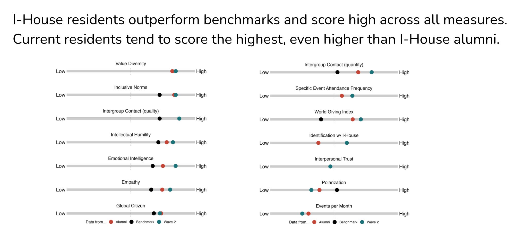 In fact, the results were even more positive than the alumni survey—The current I-House residents outperformed the benchmark samples across every measure of prosociality we measured, even higher than the I-House alumni (as seen in the future below):