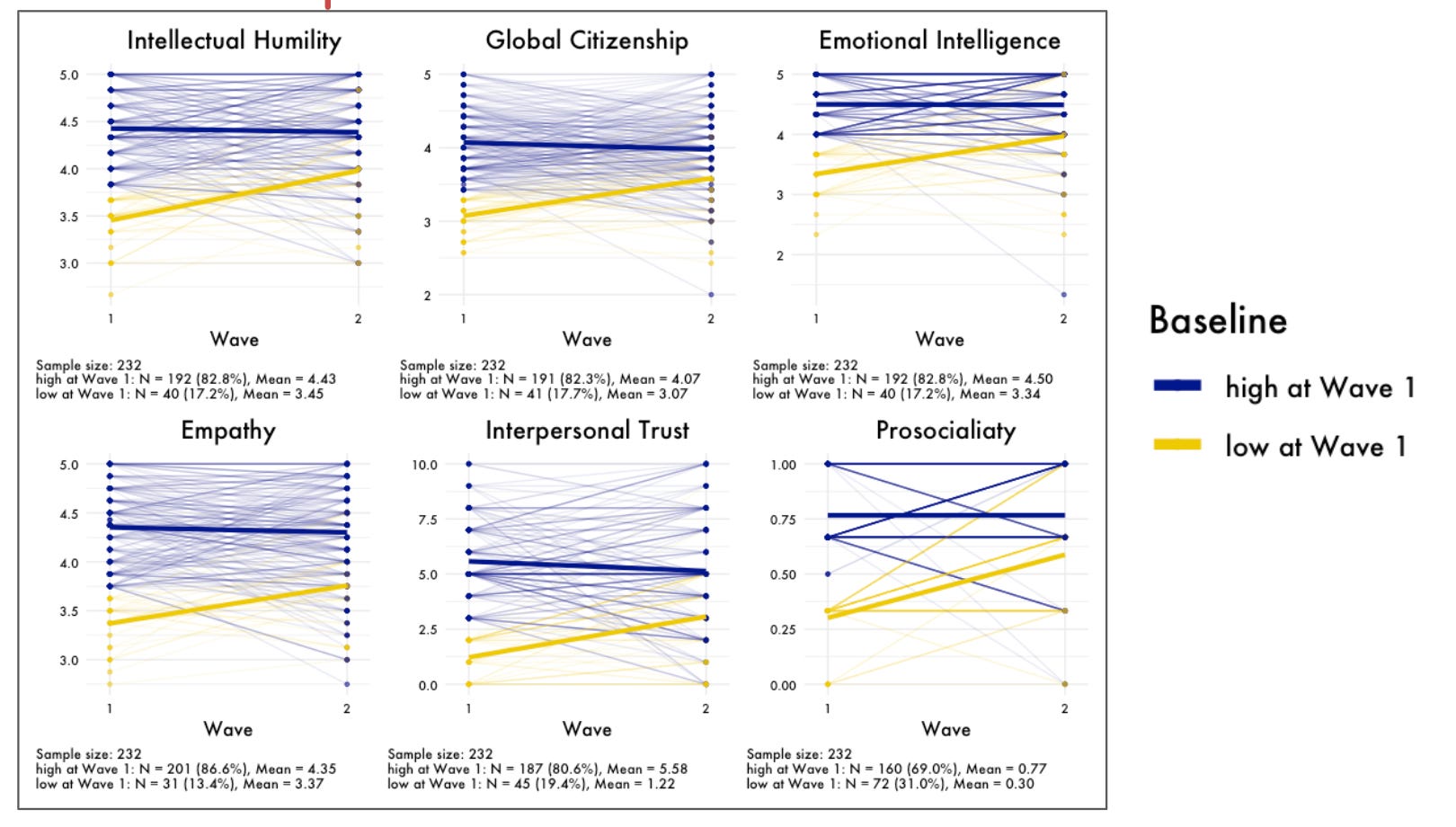 We first surveyed 1,600 alumni from I-House, dating back to the 1950s (you can read our full summary of that study here). The alumni scored very high in several prosocial traits, such as emotional intelligence and intellectual humility, empathy, and a sense of global citizenship. When we asked alumni about their prosocial behavior in the past month–using a measure known as the World Giving Index–roughly 80% of I-House alumni had helped a stranger and 60% had donated money. If I-House alumni were its own country, it would rank among the top three most prosocial nations worldwide.