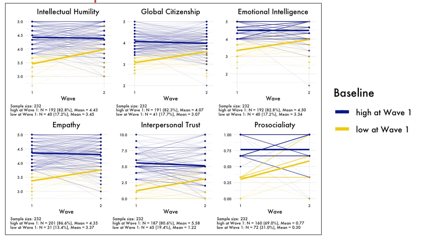 So I-House invited us back to conduct a longitudinal study with a full cohort of new residents at I-House. We measured their traits and beliefs in the first few days of the academic year (after most of them had moved into I-House) and again at the end of the semester. We warned that the results might not be as impressive.