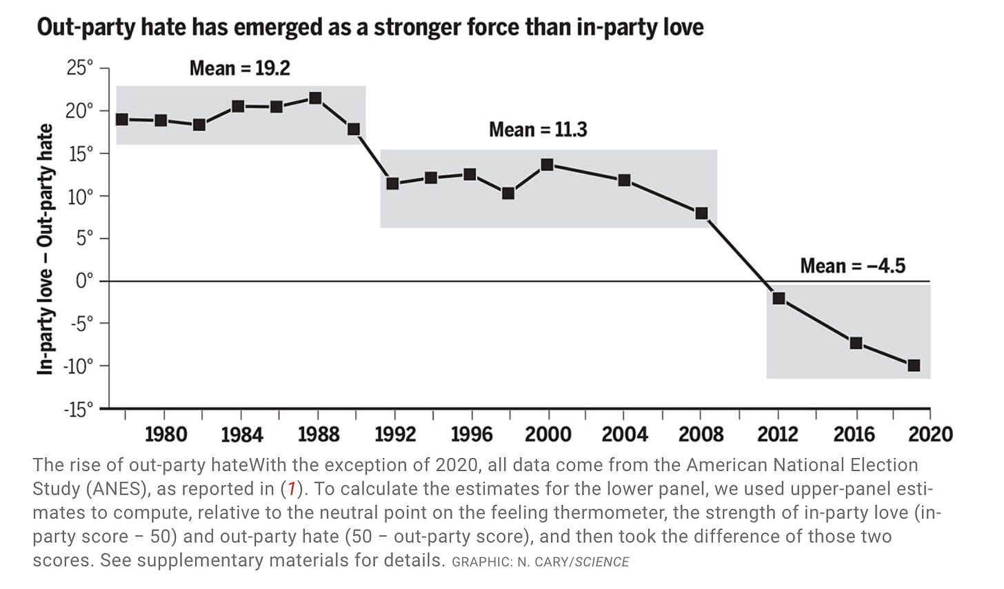 This tendency to avoid out-group sources narrows our perspectives, deepens political polarization, and can undermine trust in democratic institutions. This is part of a broader trend of political sectarianism, where the other side is seen not just as wrong, but as evil (as shown in the figure below). So, what can be done?
