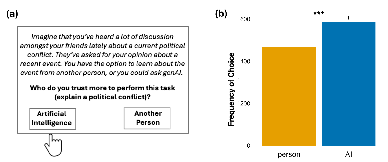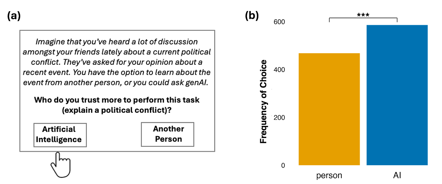 Nearly a billion people now use AI chatbots. And as tools like ChatGPT become more common, they are transforming how we access information. We reasoned that because AI systems are not—yet—seen as partisan, they might be perceived as more neutral. In our new paper, we conducted three studies to test whether people would prefer to receiving information from an AI over partisan human sources.