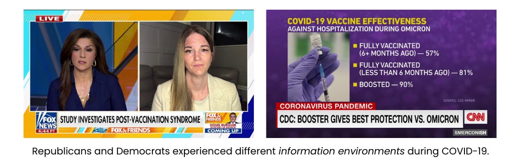 First, our social identities can affect the beliefs we hold about a behavior. This can be seen most strikingly in the way political identities affect beliefs. During the COVID-19 pandemic, Republicans and Democrats developed starkly different beliefs about the health complications arising from COVID and the risks of the vaccine. One explanation for this is that Republicans and Democrats inhabited different information environments, looking to different partisan news sources and following different influencers on social media. Because they saw different information, they developed different views.