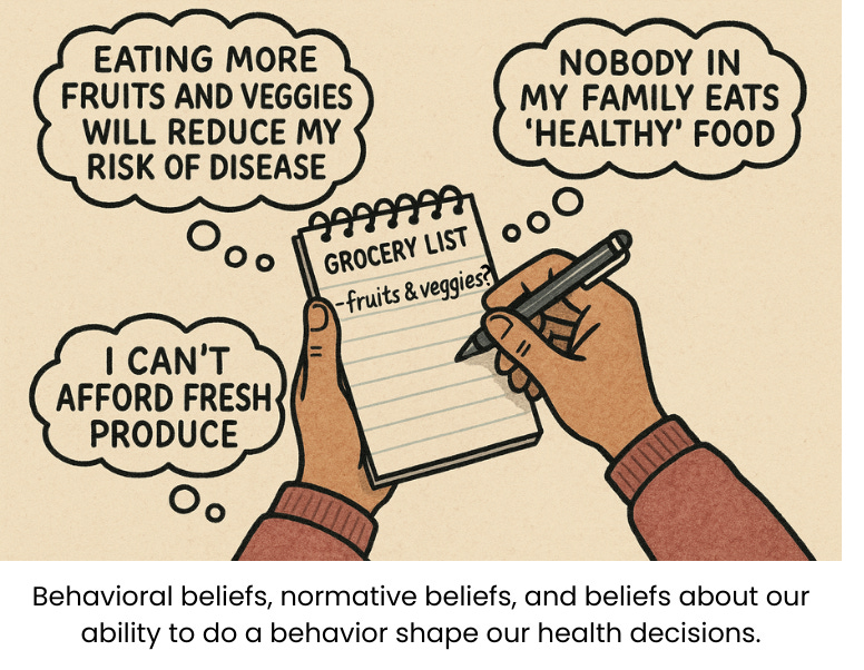 Of course, people aren’t always explicitly tallying up the pros and cons of every decision to themselves in their head. These processes can go on in the back of our minds, without us having to consciously think about them. The key takeaway is that in order to understand the health decisions a person makes, we should know what beliefs may make them want or not want to take the behavior, and how important each of these beliefs are to that person.